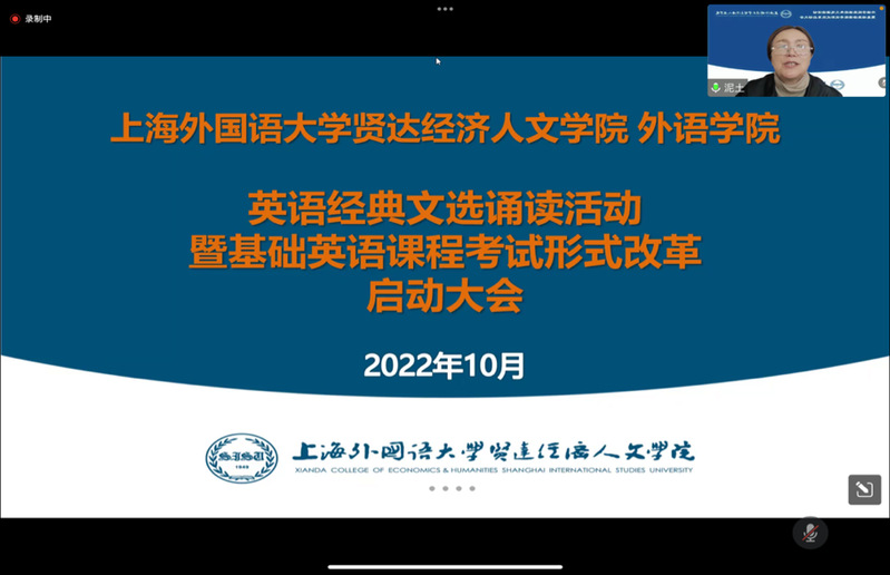10月8日上午,我校外语学院利用线上会议平台举行了2022-2023学年第一学期“英语经典文选诵读活动暨基础英语课程考试形式改革”的启动大会。梁副校长、外语学院冯奇院长、相关部处负责人及英语教师代表和英语专业学生代表参加启动会。