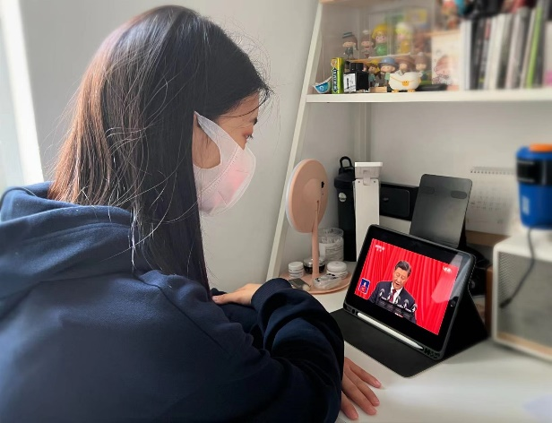 商学院学生第二党支部刘红玲:我们作为新时代的青年,更应该做好新一代青年的事,我们应该高举中国特色社会主义伟大旗帜,坚持以马克思主义中国化时代化最新成果,在以习近平同志为核心的党中央坚强领导下,再接再厉、顽强拼搏、攻坚克难。党的二十大汇聚了党心民意,绘就了宏伟蓝图,引领全国各族人民向着中华民族伟大复兴中国梦的光辉前景不断前进!