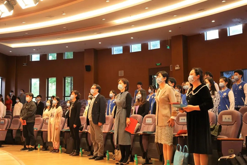 会议伊始,全体成员庄严起立,奏唱国歌。学生管理服务中心主任陈应老师为此次大会致辞。随后,校党委组织部部长陈琅玛老师宣读《关于表彰上外贤达学院2021-2022 学年春季学期校园疫情防控优秀志愿者标兵和优秀志愿者的决定》。各学院总支书记、副书记为优秀志愿者标兵代表和优秀志愿者代表颁发证书并合影留念。党委副书记王科老师为我校第五届进博会志愿者服务队授旗。