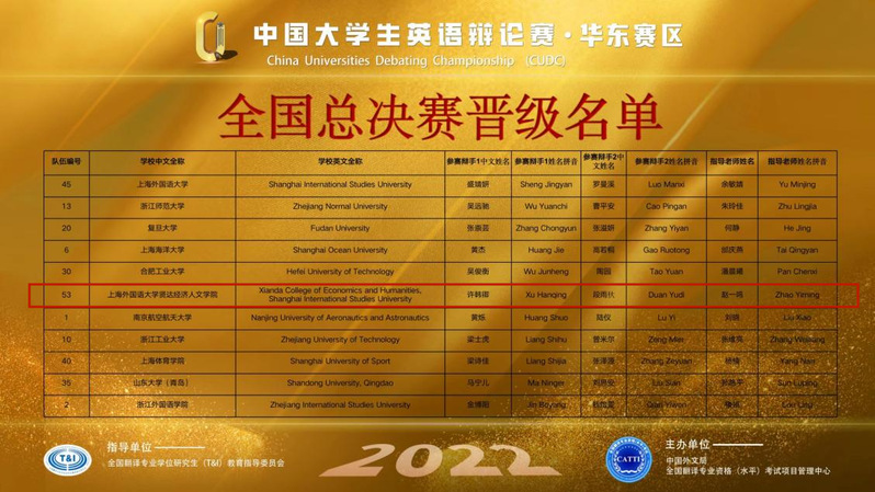 10月15-16日,由全国翻译专业学位研究生教育指导委员会指导、中国外文局CATTI项目管理中心主办的2022年中国大学生英语辩论赛(CUDC)华西、华东大区赛圆满落幕!经过两天的激烈角逐,我校国际交流学院学生许韩卿、外语学院学生段雨杕在语言学习中心赵一鸣老师的指导下表现优异,获得中国大学生英语辩论赛华东赛区一等奖并晋级全国总决赛。