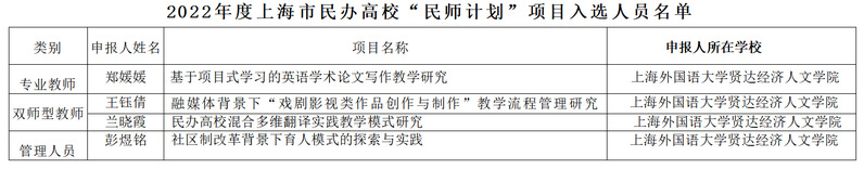 为加强新时代民办高校教师队伍建设改革,发挥与彰显优秀教师领雁作用,上海市教委、市民办教育发展基金会、市教育发展基金会联合推出了第一届上海市民办高校教师专项培育计划(简称“民师计划”),经学校推选、个人网申、市级专家评审、网上公示等环节,近日接到该计划项目入选人员名单的通知,我校郑媛媛、王钰倩、兰晓霞、彭煜铭四名教师成功入选。