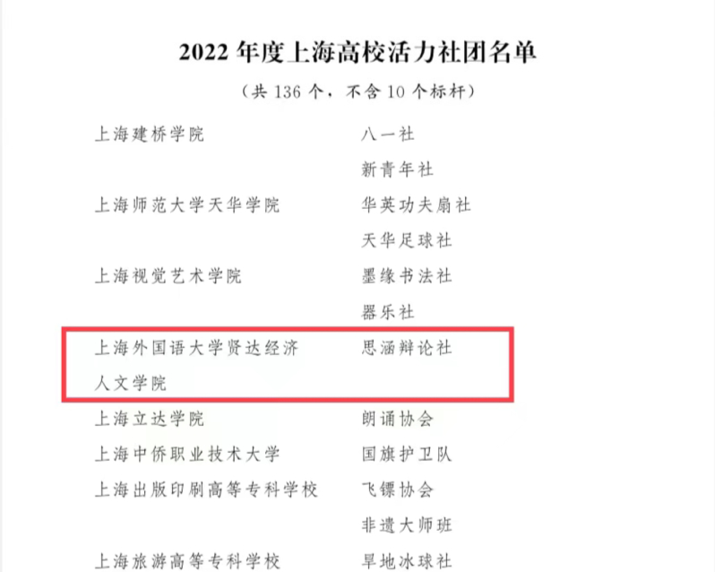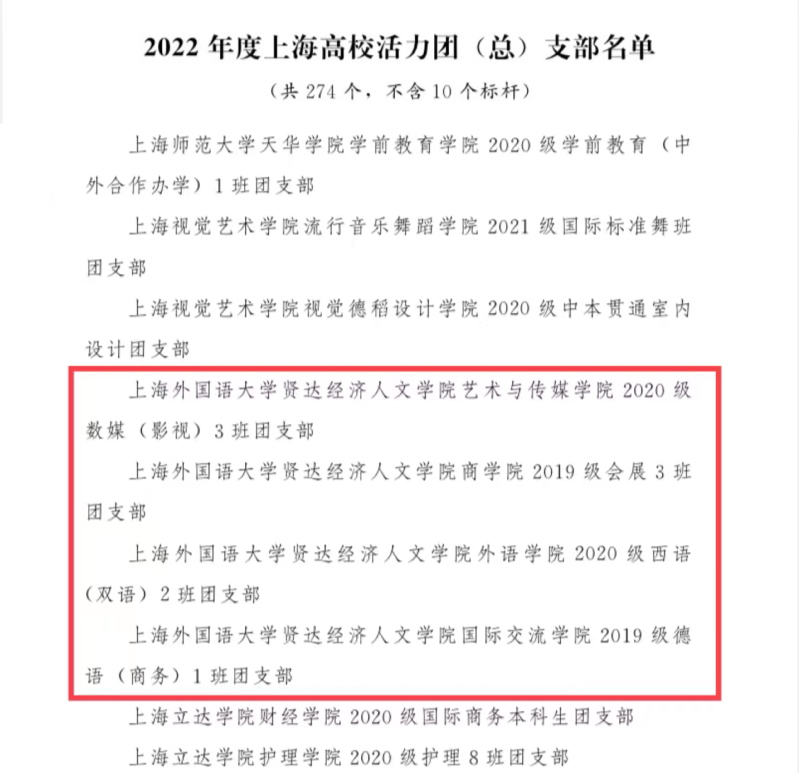 经学校团委选拔推荐,上海市教委、团上海市委审核决定,授予我校2020级数媒(影视)3班团支部、2019级会展3班团支部、2020级西语(双语)2班团支部、2019级德语(商务)1班团支部等单位“2022年度上海高校活力团(总)支部”称号,授予思涵辩论社等单位“2022年度上海高校活力社团”称号,授予商学院团委书记前白、校团委志愿者工作部副部长王佳枫等个人“2022年度上海高校团干部示范典型”称号。