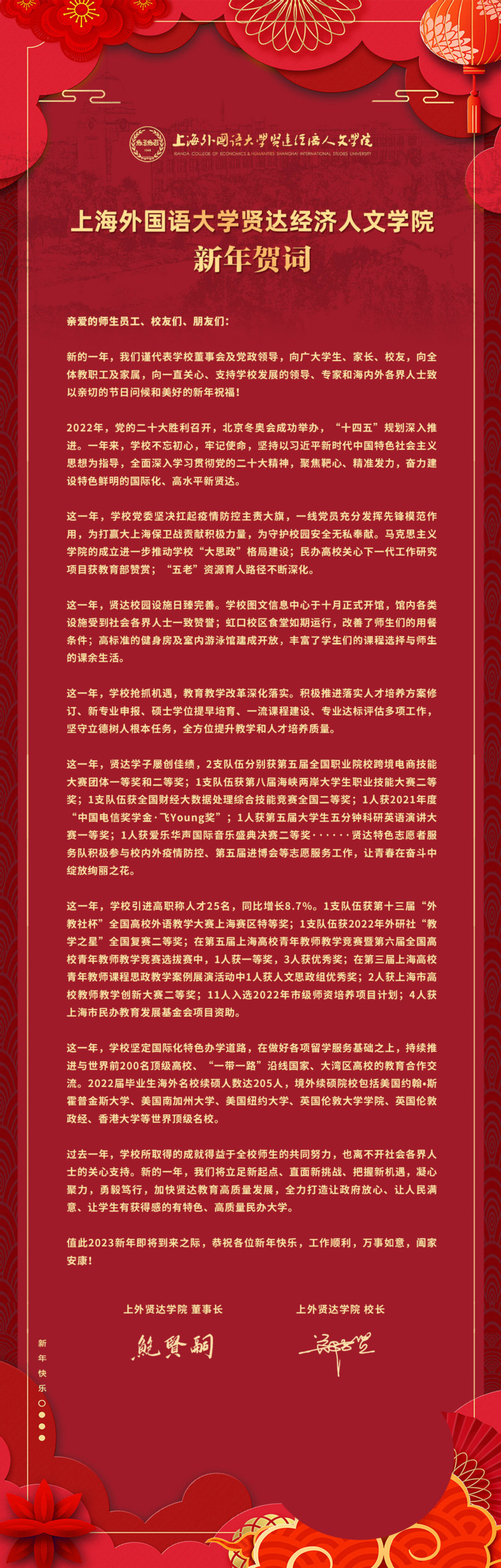 上外贤达学院二〇二三新年贺词