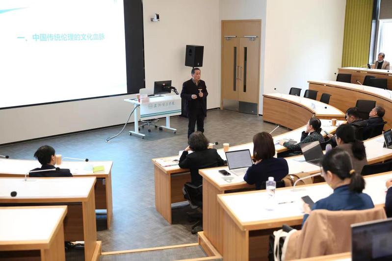 3月7号下午,学校在崇明校区国交楼312大师讲堂举办了“中层干部能力提升训练营”系列培训的第七次课程。学校邀请了上海师范大学特聘教授、博士生导师周中之教授为学员讲授《高校教育工作者的自我修养与育德能力》。周教授曾任中国伦理学会副会长,曾获全国优秀教师、宝钢优秀教师奖等称号。主持国家社会科学基金项目3项和教育部、上海市项目20余项,发表论文100余篇,主编“十五”国家级规划教材《伦理学》,著述多次获奖。