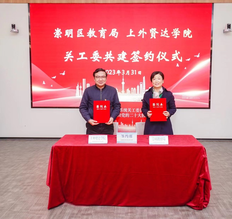 崇明区教育局副局长陆琴、上外贤达学院党委副书记王科分别代表崇明区教育局关工委与上外贤达学院关工委签约