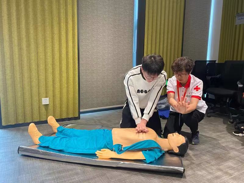 本次培训以课堂讲授、理论考试、实操练习与考核等形式,重点讲授心肺复苏术实施、自动体外除颤器(AED)的使用、创伤包扎、处理常见急症与意外伤害等多种现场急救理论知识与技能,并用人体模型进行实操演练,让参训学员逐一模拟操作,确保所有参训学员能够基本掌握急救技能,并为考核合格的学员颁发“红十字救护员”证书。