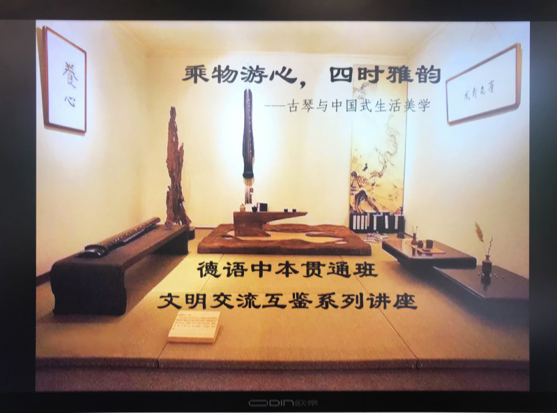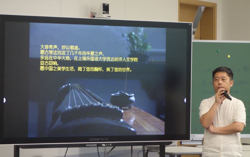 随后,赫老师向同学们介绍了古琴的兴衰史以及历史上有名的琴与琴师,并强调了文化传承与传统文化保护的重要性,尤其是八国联军为掠夺古琴上的金玉装饰而毁琴的历史,令同学们心痛不已。其间,同学们踊跃提问,围绕古琴及其历史与赫老师交流、讨论。老师也勉励大家作为外语学习者,要努力让传统文化走向世界。最终,同学们在赫老师的古琴伴奏下,一同朗诵张若虚的名篇《春江花月夜》,诗词与琴曲交相辉映,余音袅袅。