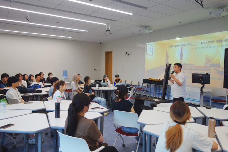 本着传播中国声音、开拓学生视野的宗旨,也为了让同学们能在紧张的期末复习中适当放松,特邀安徽省古琴学会副会长、古琴非遗传承人、鸣一琴舍创办人、中国音乐学院师资认证、考级负责人及清华大学附属学校古琴教师、民乐顾问赫浩老师来校开展讲座。