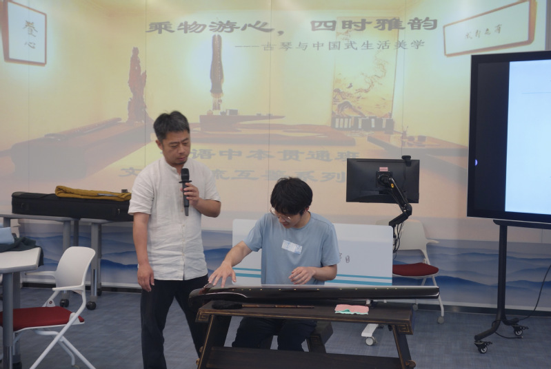 赫老师以传统文化作为切入点,从中国上古时期的神话传说引入了古琴的相关知识,妙趣横生介绍了古琴的形制及其所蕴含的天地人和五行的相关哲理。老师还请两位同学上台进行体验,在老师的指导下弹奏《沧海一声笑》和《青花瓷》的片段,同学们都感受到了中国传统乐器的神奇魅力。