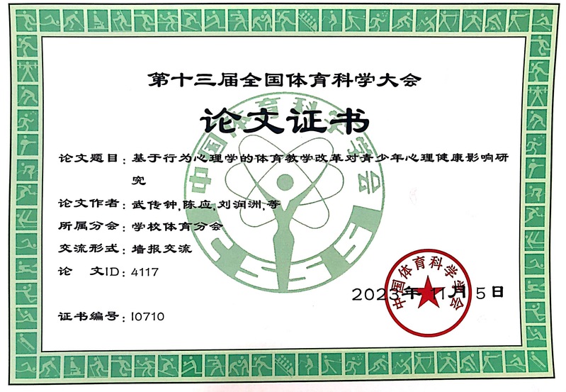 2023年11月3-5日第十三届全国体育科学大会在天津召开。我校教师武传钟、陈应与学生刘润洲(国交学院英语20-1班)等共同研究成果《基于行为心理学的体育教学改革对青少年心理健康影响研究》进行了大会墙报交流。武传钟老师受邀参会并开展学术交流。