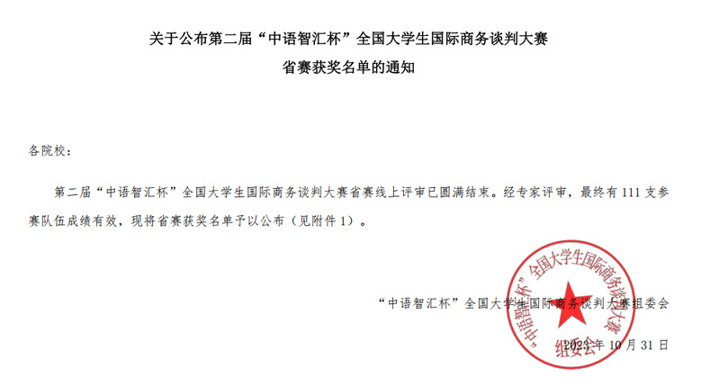 近日,第二届“中语智汇杯”全国大学生国际商务谈判大赛东部赛区省赛在线上举行,来自东部赛区5省26支参赛队伍参加角逐,我校代表队荣获东部赛区团体第一名,将代表东部赛区参加12月1日至3日在成都西南财经大学举行的全国决赛。
