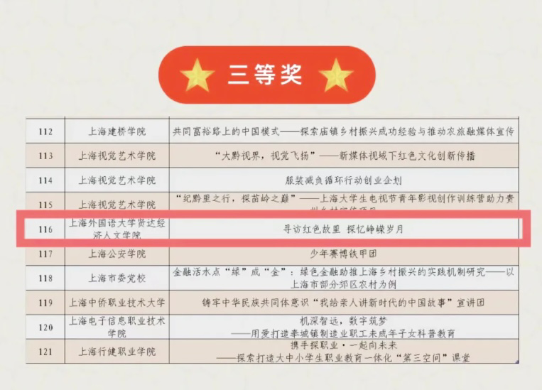 前期,我校师生积极响应,精心筹备,鼓励青年学子主动投身于社会实践中,将理论应用于实践。经实践团队申报,各高校审核推荐,市级复赛、决赛评审,其中我校“寻访红色故里,探忆峥嵘岁月”项目荣获三等奖。