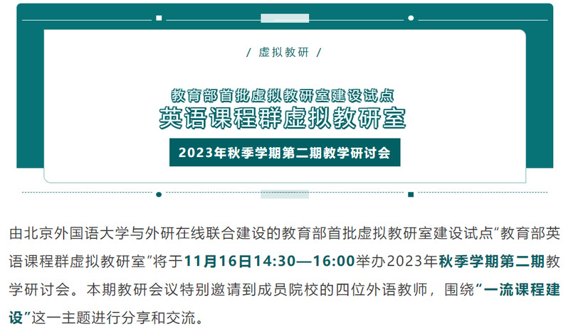 11月16日,教育部“英语课程群虚拟教研室”2023秋季学期第2期教研会议在线上召开,我校外语学院英语系蔡懿焱老师参加了会议并完成了“一流课程建设”的交流分享,获得专家好评。这是我院第三次成功推荐优秀教师参加教育部虚拟教研室的分享交流活动。