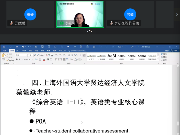 会上,蔡懿焱老师围绕建设历程、建设目标、课程内容、教学设计、课程评价、课程成效六个方面分享了《综合英语I-II》课程在上海市一流课程培育项目中的建设实践和经验,最后对项目建设进行反思,为同类的一流课程建设提供了一些参考。