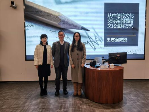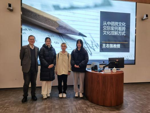 讲座结束后,王志强教授就跨文化研究方向及德语专业学生就业方向等问题,与大家进行了热烈的问答和互动。他耐心且详细地解答给同学们留下了深刻的印象。最后,我校师生代表分别与王教授合影留念。