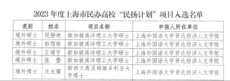 近日,上海市教育委员会和上海市民办教育发展基金会公布了2023年度“民扬计划”项目入选名单,我校倪静艳、彭煜铭、王靖宇、张蕾和沈光耀5位教师成功入选。这是我校持续推动“人才强校”战略,加强高层次人才队伍建设工作取得的又一成绩。目前倪静艳等4位教师已在新加坡南洋理工大学攻读硕士学位,沈光耀老师将于2024年赴新西兰惠灵顿维多利亚大学攻读博士学位。