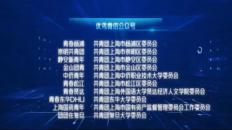 在本届大赛中,校团委“青春贤达”微信公众号在全市所有市属团组织微信公众号中脱颖而出,进入前20强,荣获“优秀微信公众号”奖;音视频作品《追光的人终会光芒万丈》,荣获“最佳音视频”奖。