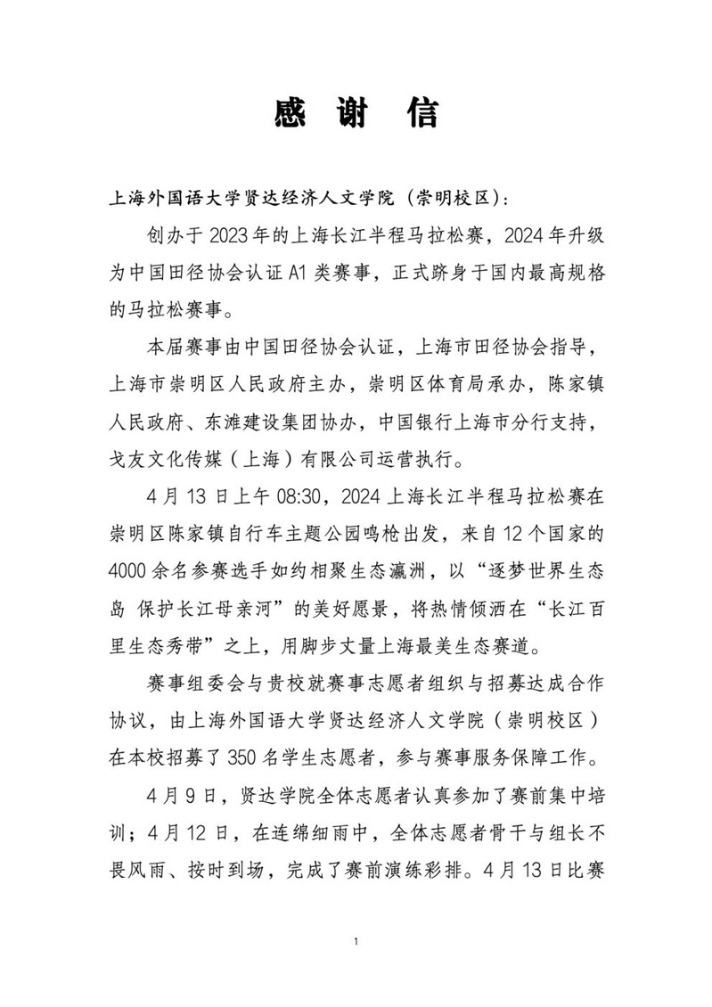 近日,2024上海长江半程马拉松组委会向我校发来感谢信,对我校本届赛事的志愿者工作及学生志愿者表示高度认可。