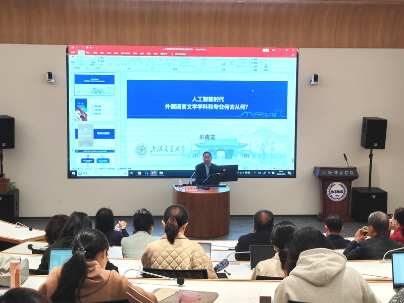 彭教授从危局与困境、变局与机遇、格局与出路切入,从不同的视角详细分析了外国语言文学学科和专业面临的局面,阐述了技术因素对外语学科带来的冲击和机遇。他鼓励我校教师要具有国际视域,正视世界科学中心的第五次转移,把视野聚焦在人工智能、基因工程、量子工程带来的重大变革,理解“人类机器化、机器人类化”的新变化。他希望我校教师关注“新四用原则”:一是更大力度的古为今用,二是更加深刻的洋为中用,三是更加包容的科技新用,四是更加务实的学研致用。
