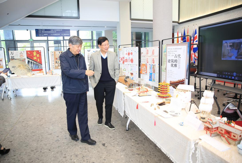 本次《理解当代中国课程》中国故事英语作品展演,于4月23日至4月30日在国交楼一楼大厅展出。活动得到了学校各部门以及各院系师生的强力支持与好评。4月29日,中国教育发展战略学会教育考试专业委员会姜钢主任来校指导,我校郑方贤校长陪同姜主任一行观看了学生的展示作品。