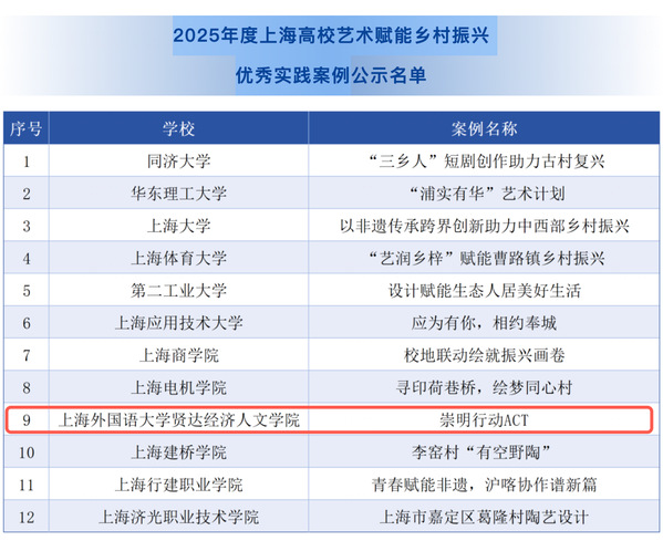 本次评选由上海市教委指导,旨在贯彻落实教育部《关于全面实施学校美育浸润行动的通知》及《上海市文教结合工作三年行动计划(2025–2027年)》,推动高校艺术资源深度融入乡村建设。经材料审核与多轮专家评审,全市共遴选出12个“优秀实践案例”,“崇明行动 ACT”位列其中。