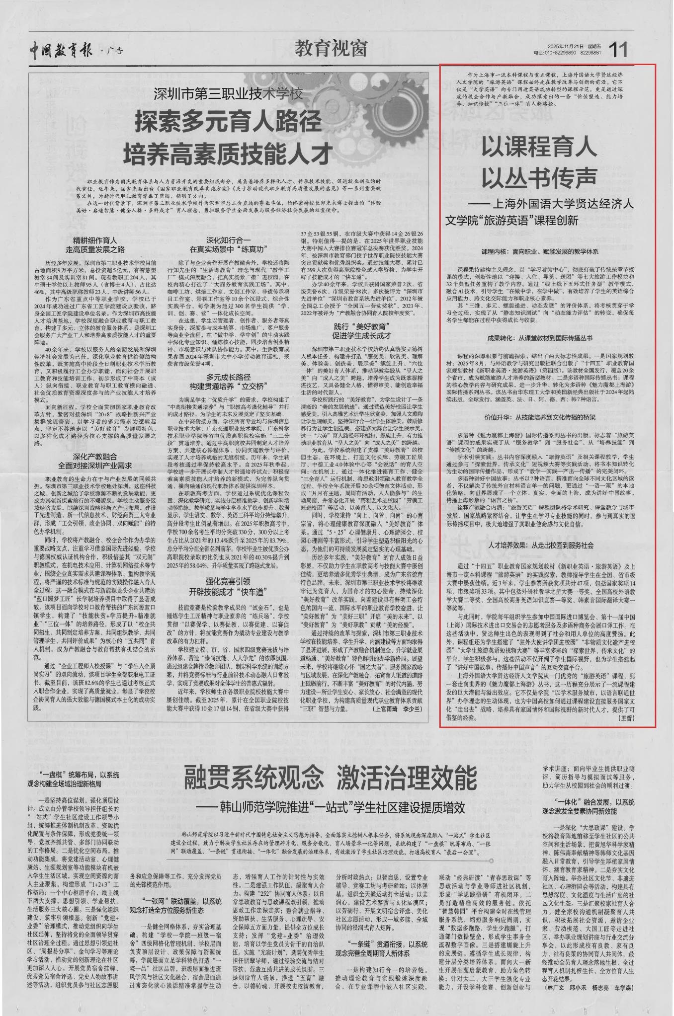 【中国教育报】以课程育人 以丛书传声——上海外国语大学贤达经济人文学院“旅游英语”课程创新