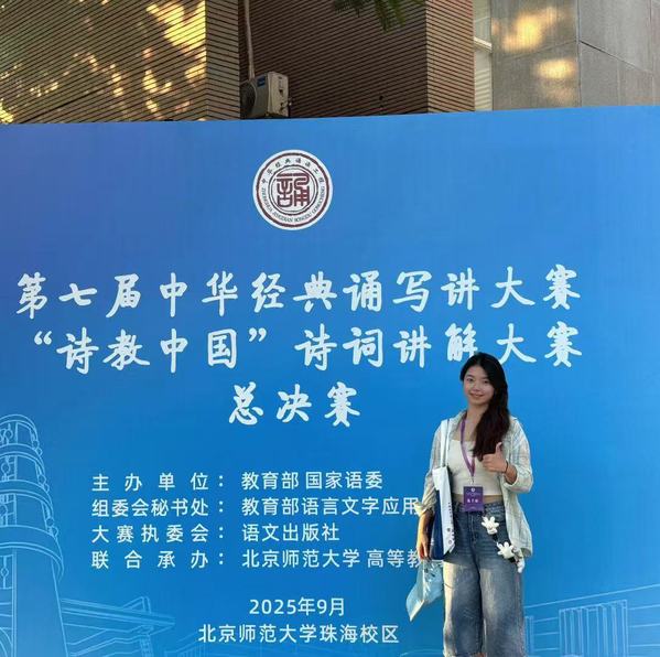 近日,第七届中华经典诵写讲大赛“诗教中国”诗词讲解大赛全国总决赛圆满落幕。我校教育学院学前教育专业卢文文同学,在李佳颖老师的悉心指导下,历经层层严苛选拔,荣获全国总决赛二等奖。