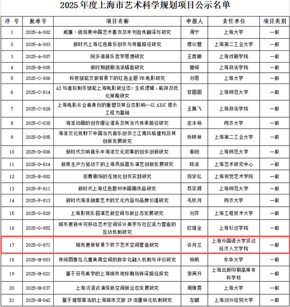 近日,根据上海市艺术科学规划领导小组办公室公示名单,我校许月兰老师申报的城市更新背景下桥下艺术空间营造研究课题成功获批立项资助